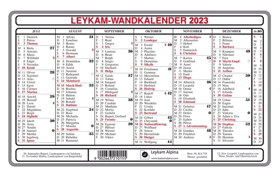 Der LEYKAM Wandkalender mit österreichischem Kalendarium hat eine übersichtliche Einteilung auf zwei Seiten. Auf jeder Seite befinden sich 6 Monate, Wochennummerierung sowie rot gekennzeichnete Sonn- und Feiertage.
