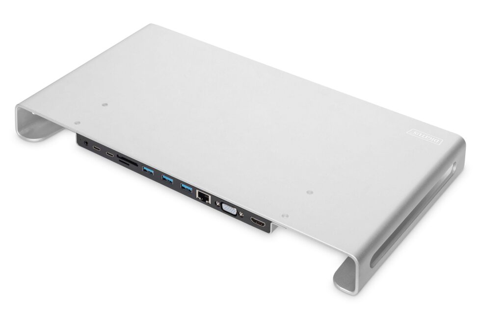 Die DIGITUS Monitorerhöhung ist aus Aluminium gefertigt und hat eine multifunktionale Dockingstation integriert. Die Erhöhung hat eine maximale Traglast von 25 kg. Die Dockingstation erweitert den USB Type-C-Port um 11 weitere Schnittstellen. Im Lieferumfang ist ein 14 cm langes USB-C Anschlusskabel enthalten.